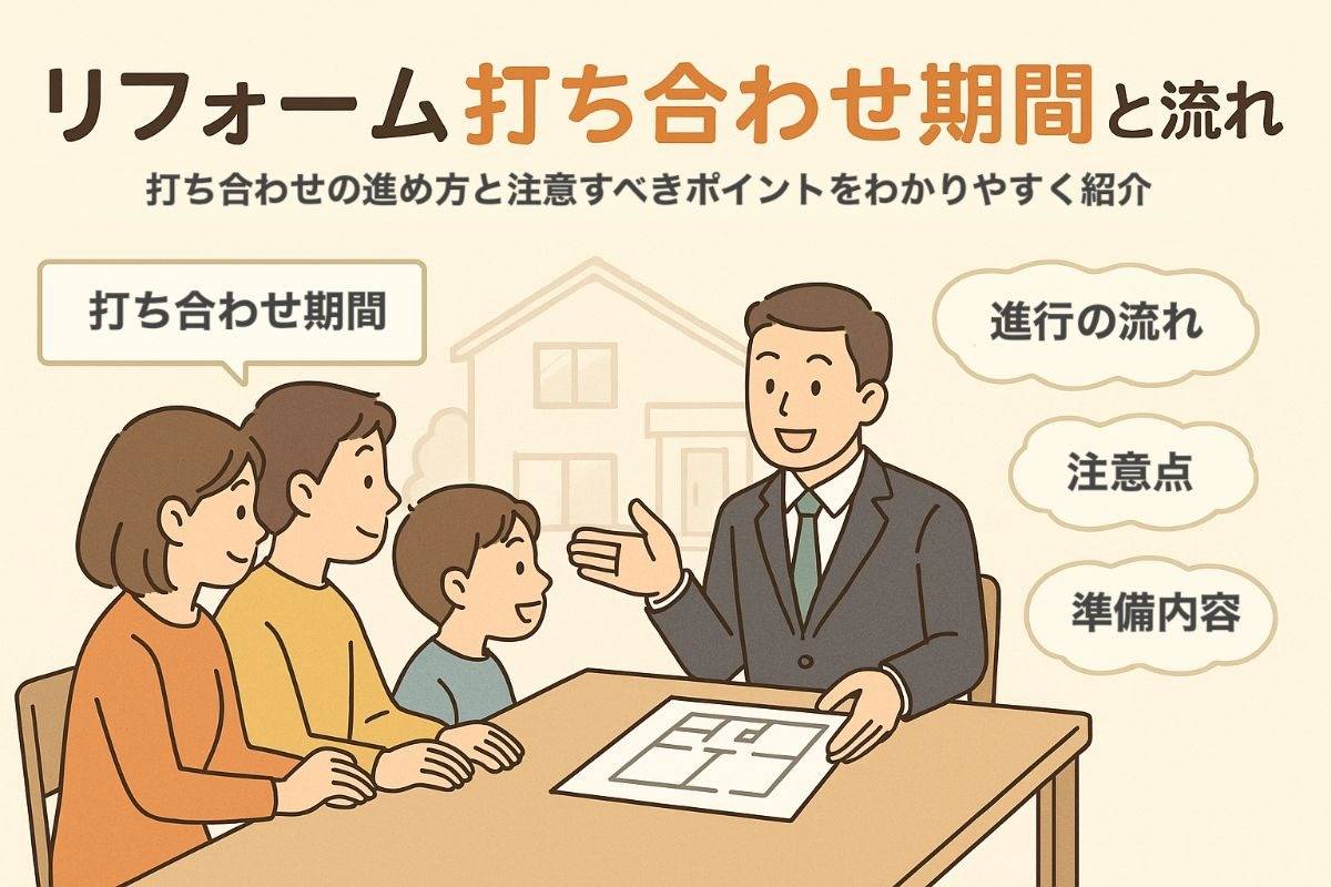 リフォームの打ち合わせ期間は1週間から2週間程度が一般的です。工事の規模が大きい場合や、間取りの変更・設備交換を伴う場合は約3週間以上かかることもあります。